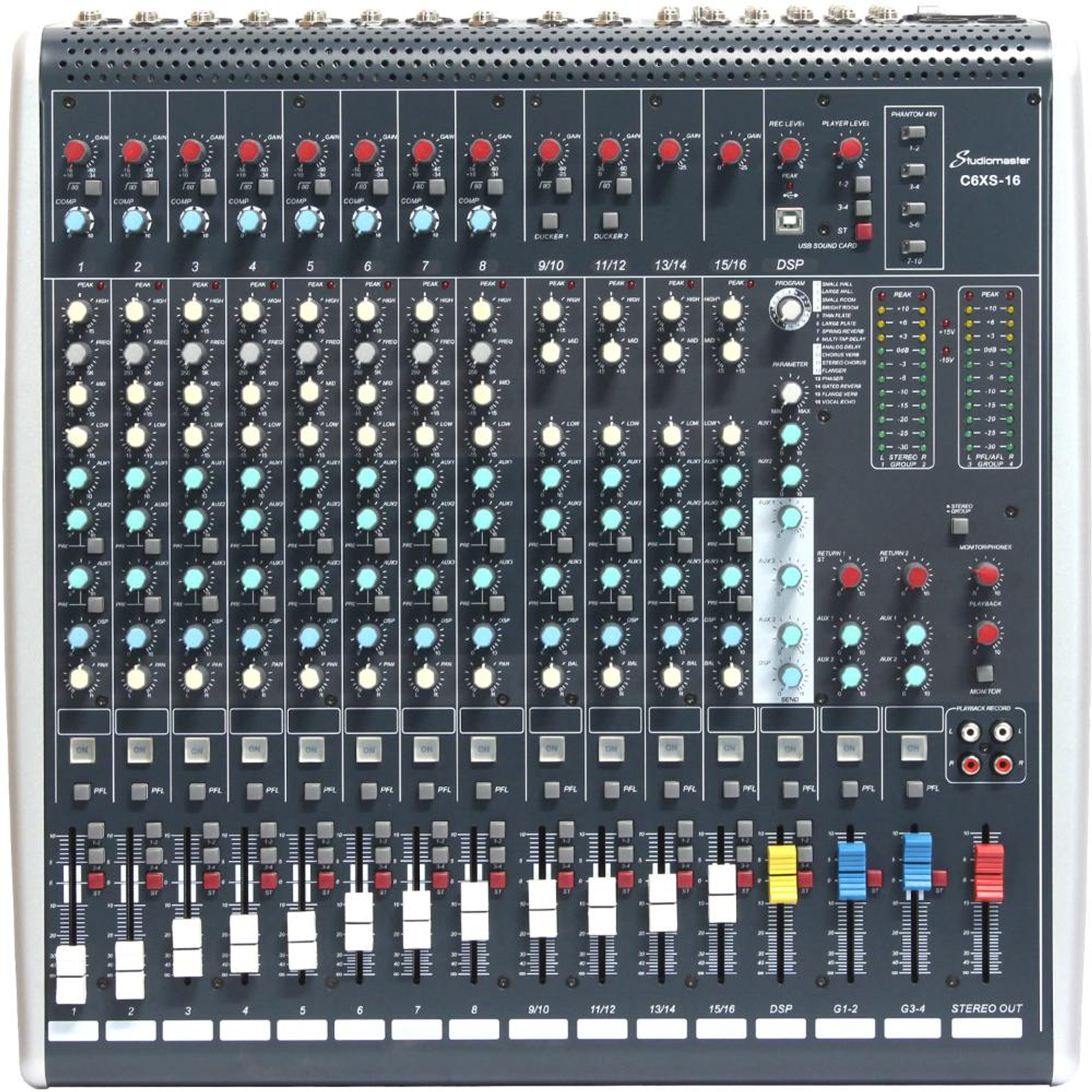 Ofreciendo una solución portátil y liviana, estas mesas son perfectas tanto para presentaciones en vivo como para aplicaciones de grabación en el hogar. Construida con la última tecnología de moldeo robusto, los beneficios de resistencia y peso hacen que estas unidades sean altamente portátiles. Con 10 canales de micrófono con compresor ajustable incorporado en cada canal y 4 canales estéreo. Todos los canales de entrada cuentan con ecualizador de 3 bandas, 4 auxiliares, bus de escucha Pan/Balance PFL, conmutación de canal y funciones de enrutamiento integrales a la mezcla principal o a los subgrupos estéreo. Con las mismas características y virtudes del mixer C6-16 de Studiomaster, en este modelo C6XS-16 la gama es mejorada con siguientes otros atributos tales como entradas USB para grabación y reproducción estéreo, lo que lo hace ideal para proyectos de grabación en el hogar o para proporcionar música de base a su actuación en vivo. También se incluye una unidad de efectos DSP de 16 programas de alta calidad con varios efectos de reverberación, eco, coro y delay. Los modelos de esta serie incluyen además alimentación fantasma de +48 V en los canales de micrófono, faders suaves de 60 mm de alta calidad, salidas XLR balanceadas y una fuente de alimentación conmutada interna robusta y silenciosa.